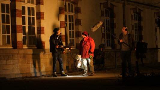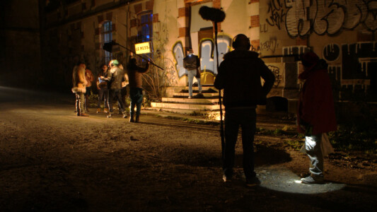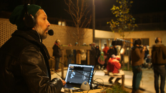 Nous avions envie de travailler sur des déambulations guidées qui prendraient la forme d’une exploration cinématographique. Une ville, un quartier, un village, un chantier, une friche, autant de lieux qui deviennent des décors dans lesquels se joue un plan séquence, un tournage de cinéma dans lequel la caméra est remplacée par la vision du spectateur. Le scénario est toujours le même, un mystérieux personnage habite un territoire, et erre chaque soir à la manière d’un veilleur de nuit. L’écriture du plan séquence qui se joue en direct est protéiforme. Nous fabriquons des images cinématographiques, des cadres imaginaires, composés par de la lumière mouvante en direct, des vidéoprojections, des tableaux vivants. La bande-son est quant à elle diffusée par des casques sans fil, qui plongent le spectateur dans les différents plans sonores du film. Du son direct capté par un perchman, une voix, celle des pensées du personnage, des ambiances qui peuplent ou détournent les lieux visités, de la musique qui souligne ou dramatise les actions. Autant d’éléments qui vont permettre au spectateur de basculer dans le récit en oubliant l’équipe technique qui s’agite et compose le film en direct, comme il oublierait des marionnettistes à vue.