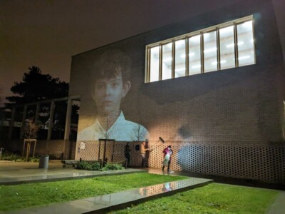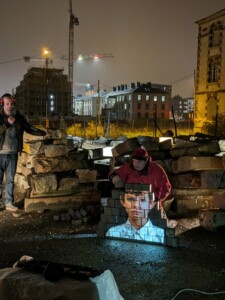 Nantes, caserne Mellinet, décembre 2023. 23h, il fait froid et une pluie fine tombe sous la lumière orange des éclairages de chantier. Une camionnette blanche est posée sur des parpaings, un homme s’en extirpe difficilement. Chaque nuit, il erre dans cette friche chargée d’histoire, mélange de bâtiments militaires désertés, de logements flambant neufs, d’immeubles en construction, de tas de gravats, d’empilement de pavés. Dans une déambulation sous casque, où les sons et les voix se mélangent aux jeux de lumières, les vidéoprojections sur paysage nous dévoilent les figures de ceux qui veillent sur la caserne.